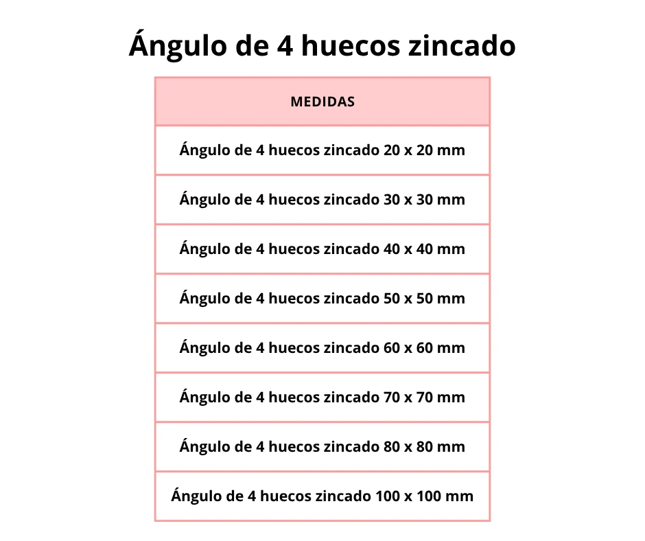 El ángulo de 4 huecos zincado es un herraje metálico en forma de “L” que incorpora perforaciones estratégicas para facilitar su instalación mediante tornillos o pernos. El recubrimiento de zinc le brinda protección frente al desgaste y la corrosión.