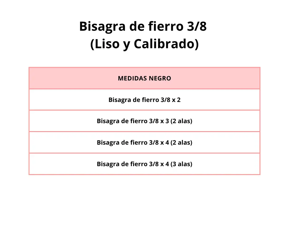 La bisagra de fierro 3/8, disponible en versiones liso y calibrado, es un herraje de alta resistencia diseñado para garantizar un movimiento estable y seguro en puertas y estructuras metálicas. Se presenta en modelos de 2 o 3 alas, lo que permite adaptarse a diferentes necesidades de instalación y niveles de soporte. Su fabricación en fierro sólido le otorga durabilidad y confiabilidad en trabajos de uso frecuente.