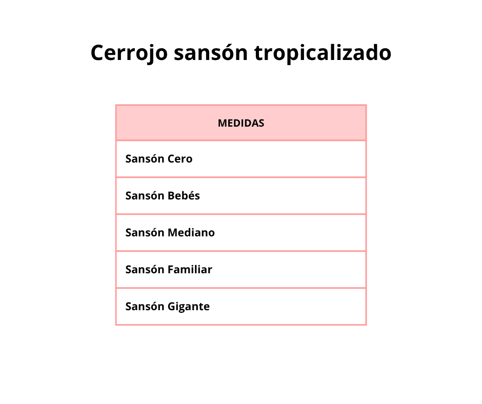 Tamaño | Sansón cero, Sansón bebé, Sansón mediano, Sansón familiar, Sansón gigante |