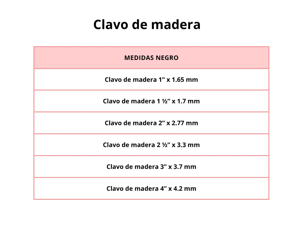 Medidas | 1”x1.65mm, 1 ½”x1.7mm, 2”x2.77mm, 2 ½”x3.3mm, 3”x3.7mm, 4”x4.2mm |