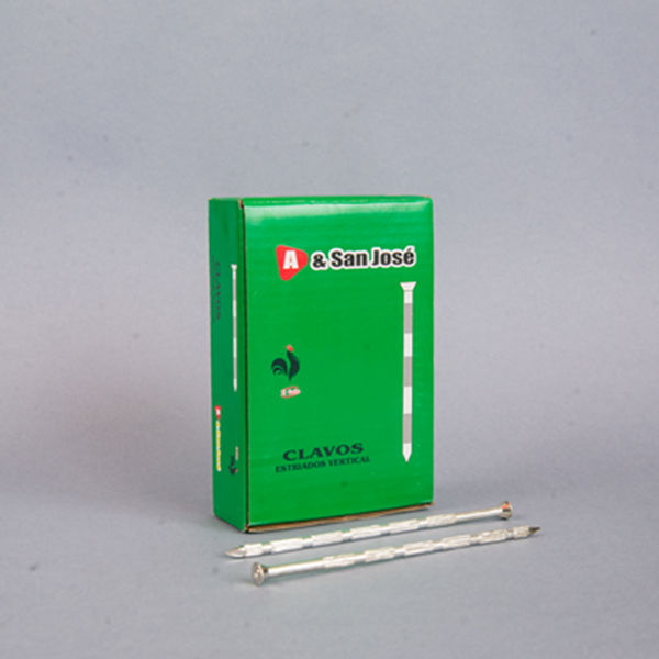 El clavo estriado vertical es un elemento de fijación fabricado en acero, diseñado con estrías a lo largo de su cuerpo que aumentan la fricción y mejoran el anclaje en la superficie donde se aplica. Su acabado lo hace resistente al uso frecuente y a la extracción accidental.