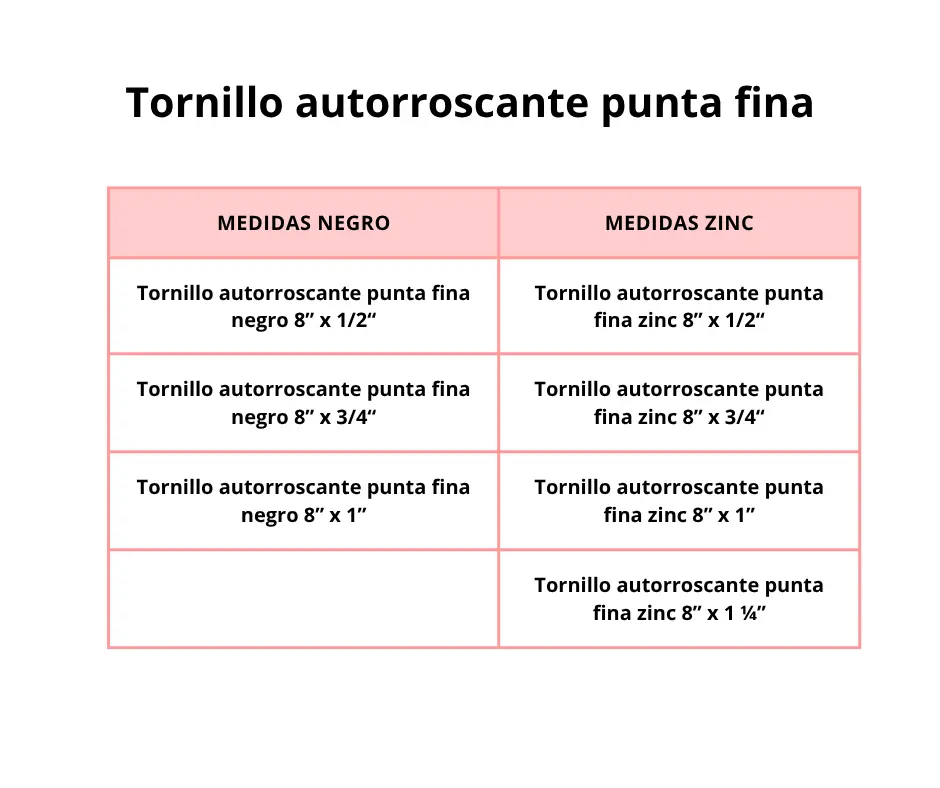 Medidas | 8” x 1/2”, 8” x 3/4”, 8” x 1”, 8” x 1 ¼” |