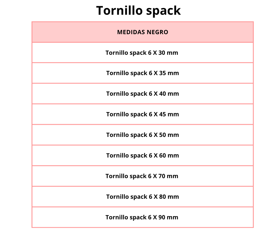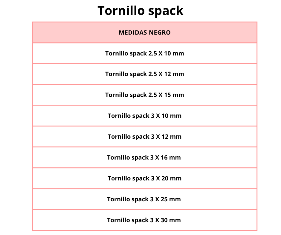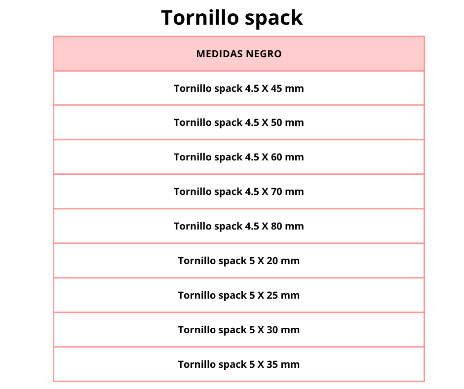 Medidas | 2.5 x 10 mm, 2.5 x 12 mm, 2.5 x 15 mm, 3 x 10 mm, 3 x 12 mm, 3 x 16 mm, 3 x 20 mm, 3 x 25 mm, 3 x 30 mm, 3.5 x 12 mm, 3.5 x 16 mm, 3.5 x 20 mm, 3.5 x 25 mm, 3.5 x 30 mm, 3.5 x 35 mm, 3.5 x 40 mm, 3.5 x 45 mm, 3.5 x 50 mm, 4 x 12 mm, 4 x 16 mm, 4 x 20 mm, 4 x 25 mm, 4 x 30 mm, 4 x 35 mm, 4 x 40 mm, 4 x 45 mm, 4 x 50 mm, 4 x 60 mm, 4 x 70 mm, 4 x 80 mm, 4 x 90 mm, 4.5 x 20 mm, 4.5 x 25 mm, 4.5 x 30 mm, 4.5 x 35 mm, 4.5 x 40 mm, 4.5 x 45 mm, 4.5 x 50 mm, 4.5 x 60 mm, 4.5 x 70 mm, 4.5 x 80 mm, 5 x 20 mm, 5 x 25 mm, 5 x 30 mm, 5 x 35 mm, 5 x 40 mm, 5 x 45 mm, 5 x 50 mm, 5 x 60 mm, 5 x 70 mm, 5 x 80 mm, 5 x 90 mm, 5 x 100 mm, 6 x 25 mm, 6 x 30 mm, 6 x 35 mm, 6 x 40 mm, 6 x 45 mm, 6 x 50 mm, 6 x 60 mm, 6 x 70 mm, 6 x 80 mm, 6 x 90 mm, 6 x 100 mm, 6 x 120 mm |